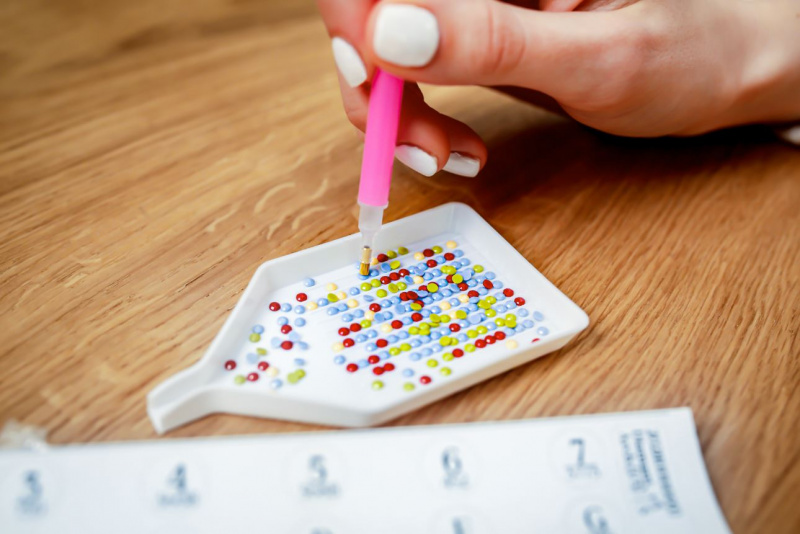 - Kleben Sie zuerst die Diamanten einer Farbe und fahren Sie dann mit der nächsten fort.