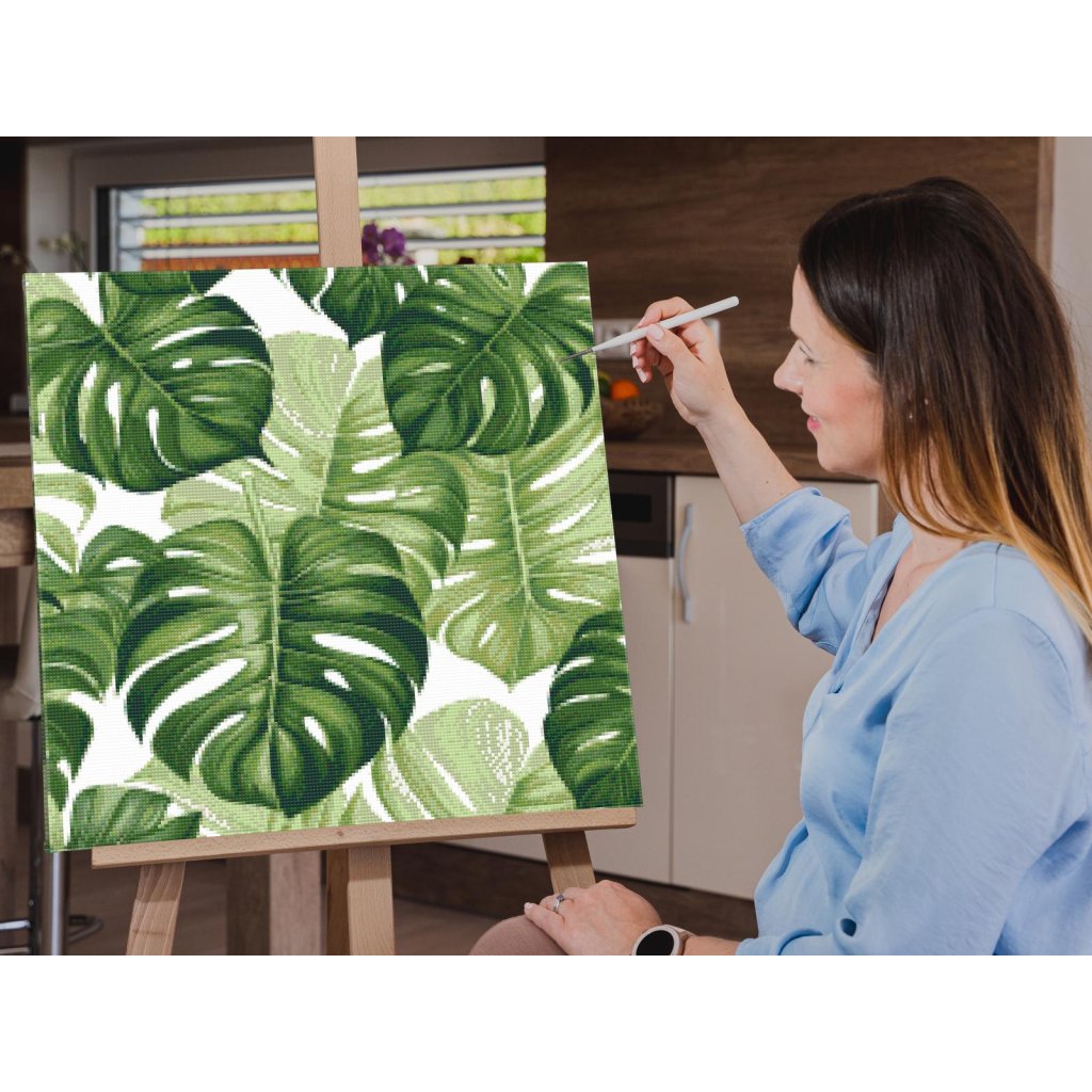 Sie werden es auf jeden Fall zu schätzen wissen, dass Sie auf die Diamanten keinen Kleber auftragen müssen. Der gesamte Diamantierungsprozess ist dank der klebrigen Oberfläche der Leinwand sehr sauber und ganz ohne eingeklemmte Finger. Nach und nach decken Sie die Schutzfolie einfach an der Stelle ab, an die Sie die Diamanten gerade platzieren möchten und setzen Sie sie direkt auf die Leinwand, wo sie schön haften.