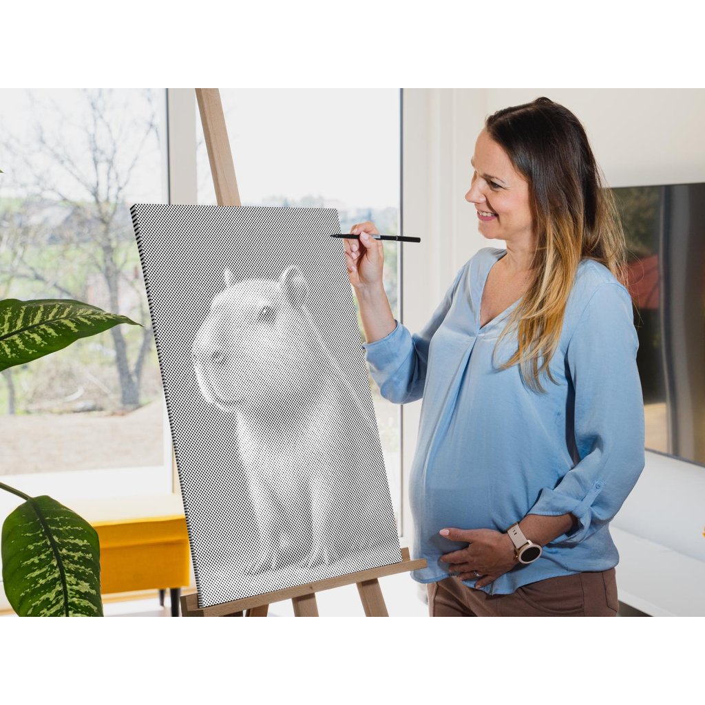 Bei der Punktmalerei muss man manchmal ganz sanft kleine Punkte setzen, aber es kommt auch vor, dass man Stift etwas stärker aufdrücken oder den ganzen Kreis ausmalen muss. Es dauert ein wenig bis Ihr Motiv auf der Leinwand zu erkennen wird. Aber sobald es Gestalt annimmt, werden Sie vor Freude und Begeisterung jubeln!