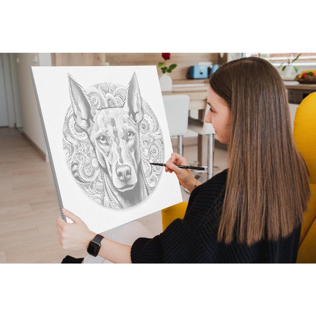 Bei der Punktmalerei muss man manchmal ganz sanft kleine Punkte setzen, aber es kommt auch vor, dass man Stift etwas stärker aufdrücken oder den ganzen Kreis ausmalen muss. Es dauert ein wenig bis Ihr Motiv auf der Leinwand zu erkennen wird. Aber sobald es Gestalt annimmt, werden Sie vor Freude und Begeisterung jubeln!
